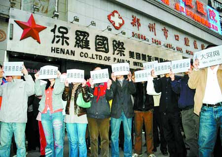 这一群由大河网-大河论坛的网友自发组成的闪客行动,在保罗国际门口举行抗议活动。他们将写着“很黑很后台”的十六开纸举在头顶,表示他们对保罗国际的不满。